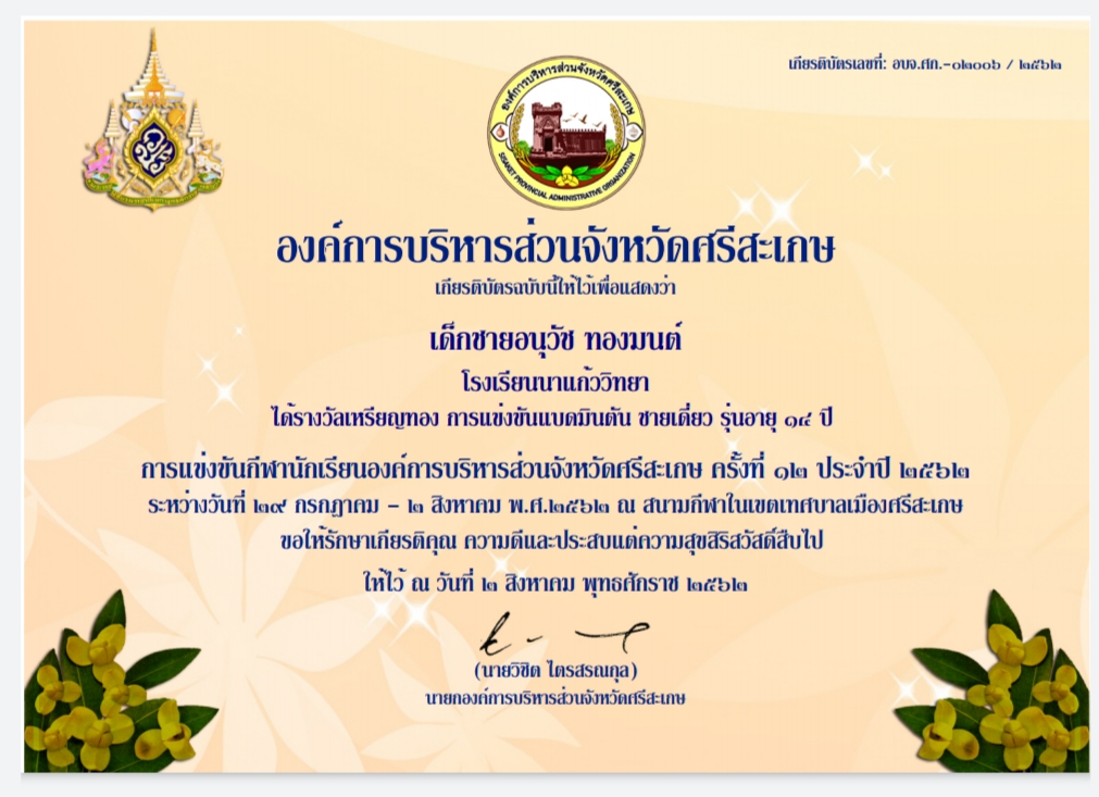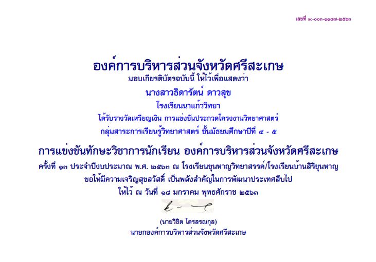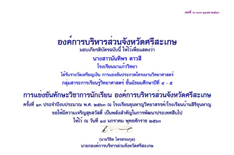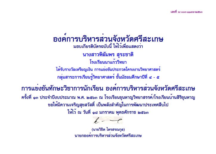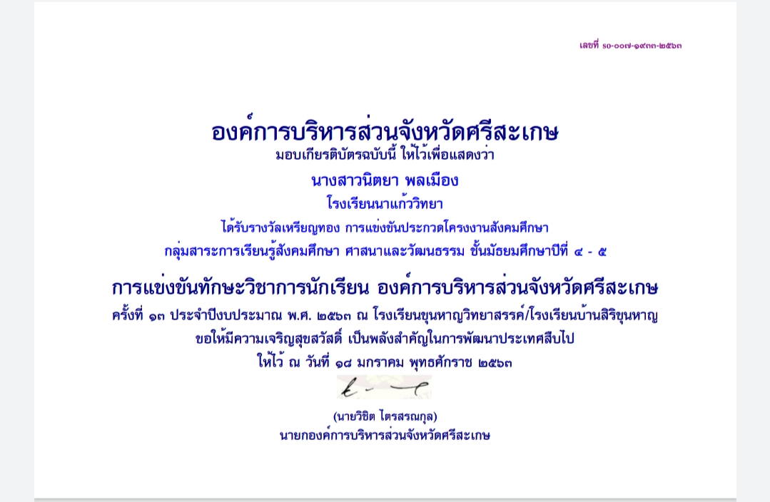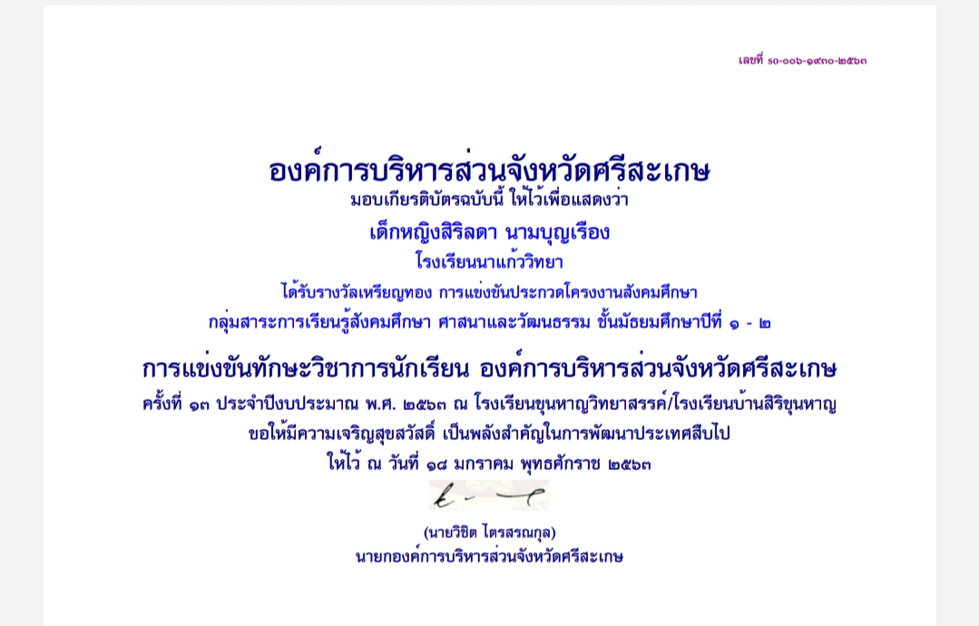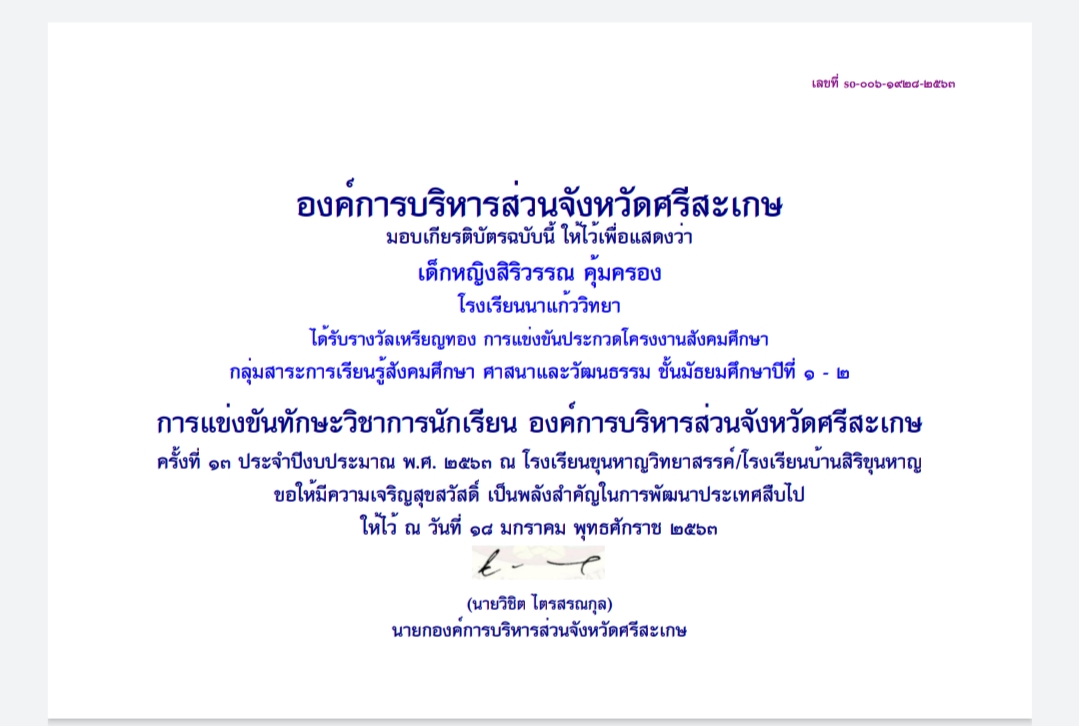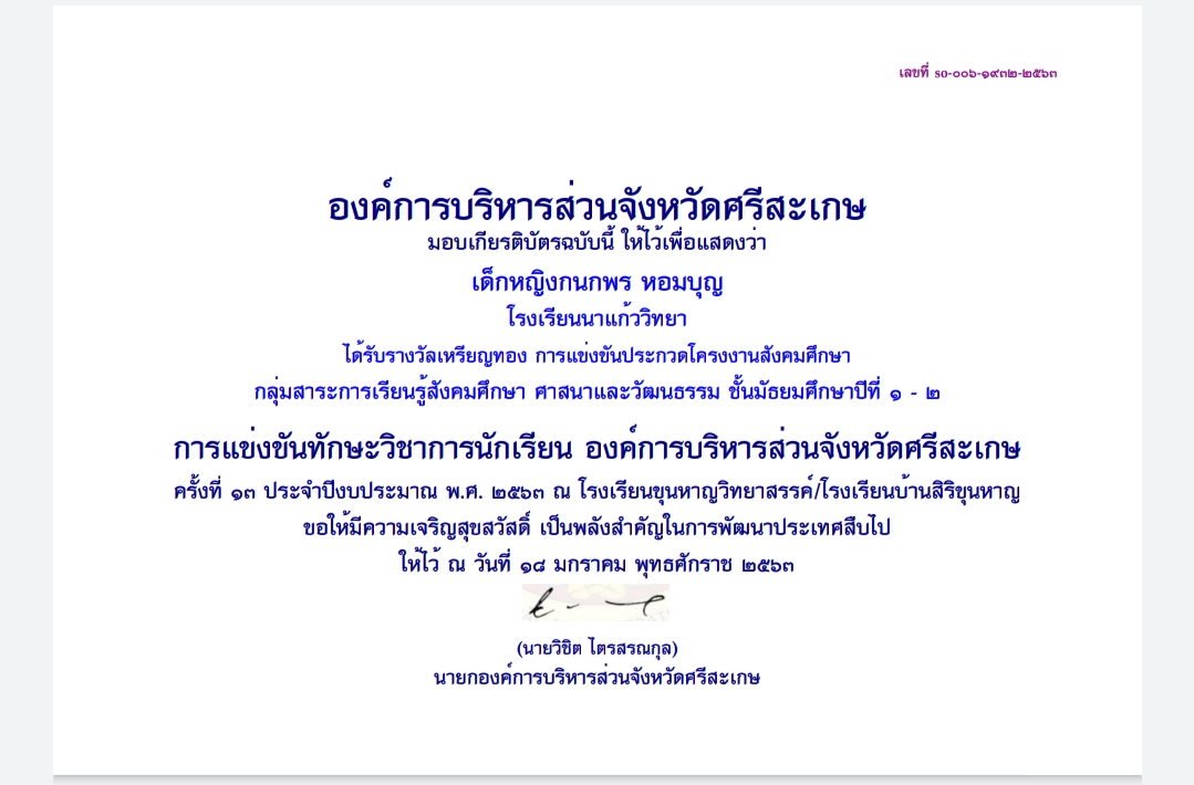 ชื่อผลงาน : รางวัลเหรียญทอง การแข่งขันประกวดโครงงานสังคมศึกษา ระดับชั้นมัธยมศึกษาปีที่ 1 - 2 การแข่งขันทักษะวิชาการนักเรียน ครั้งที่ 13 ประจำปีงบประมาณ 2563 โรงเรียนขุนหาญวิทยาสรรค์/โรงเรียนบ้านสิริขุนหาญ