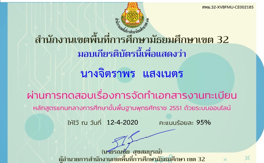 เกียรติบัตรอบรมออนไลน์เรื่อง การจัดทำเอกสารงานทะเบียน