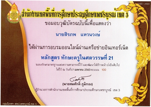 ชื่อผลงาน : เกียรติบัตรการอบรมออนไลน์ หลักสูตรทักษะครูในศตวรรษที่ 21