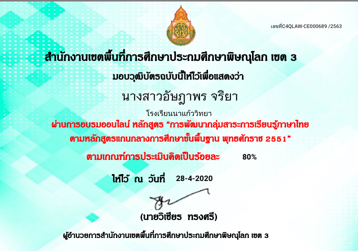 ชื่อผลงาน : การพัฒนากลุ่มสาระการเรียนรู้ภาษาไทย ตามหลักสูตรแกนกลางการศึกษาขั้นพื้นฐาน พุทธศักราช2551