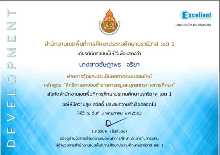 ชื่อผลงาน : เกียรติบัตรออนไลน์ เรื่อง สิทธิการลาของข้าราชการครูและบุคลากรทางการศึกษา