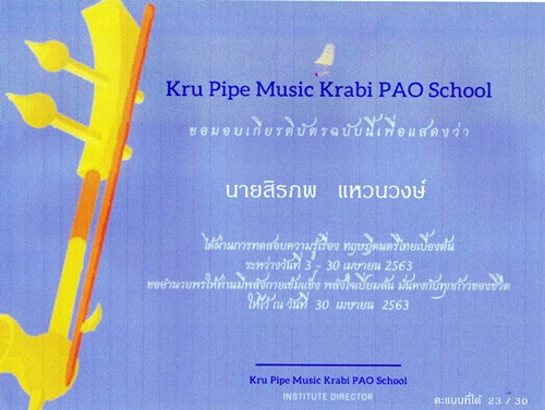 ชื่อผลงาน : เกียรติบัตรการอบรมออนไลน์ เรื่อง ทฤษฎีดนตรีไทยเบื้องต้น