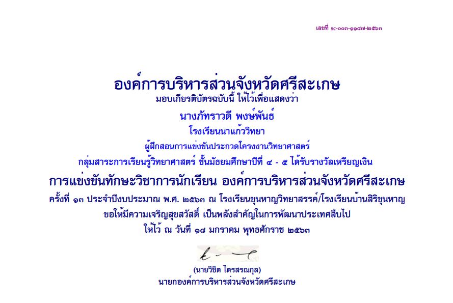 ชื่อผลงาน : ผู้ฝึกสอนการแข่งขันโครงงานวิทยาศาสตร์ กลุ่มสาระการเรียนรู้วิทยาศาสตร์ ชั้นมัธยมศึกษาปีที่ 4-5 ได้รับรางวัลเหรียญเงิน