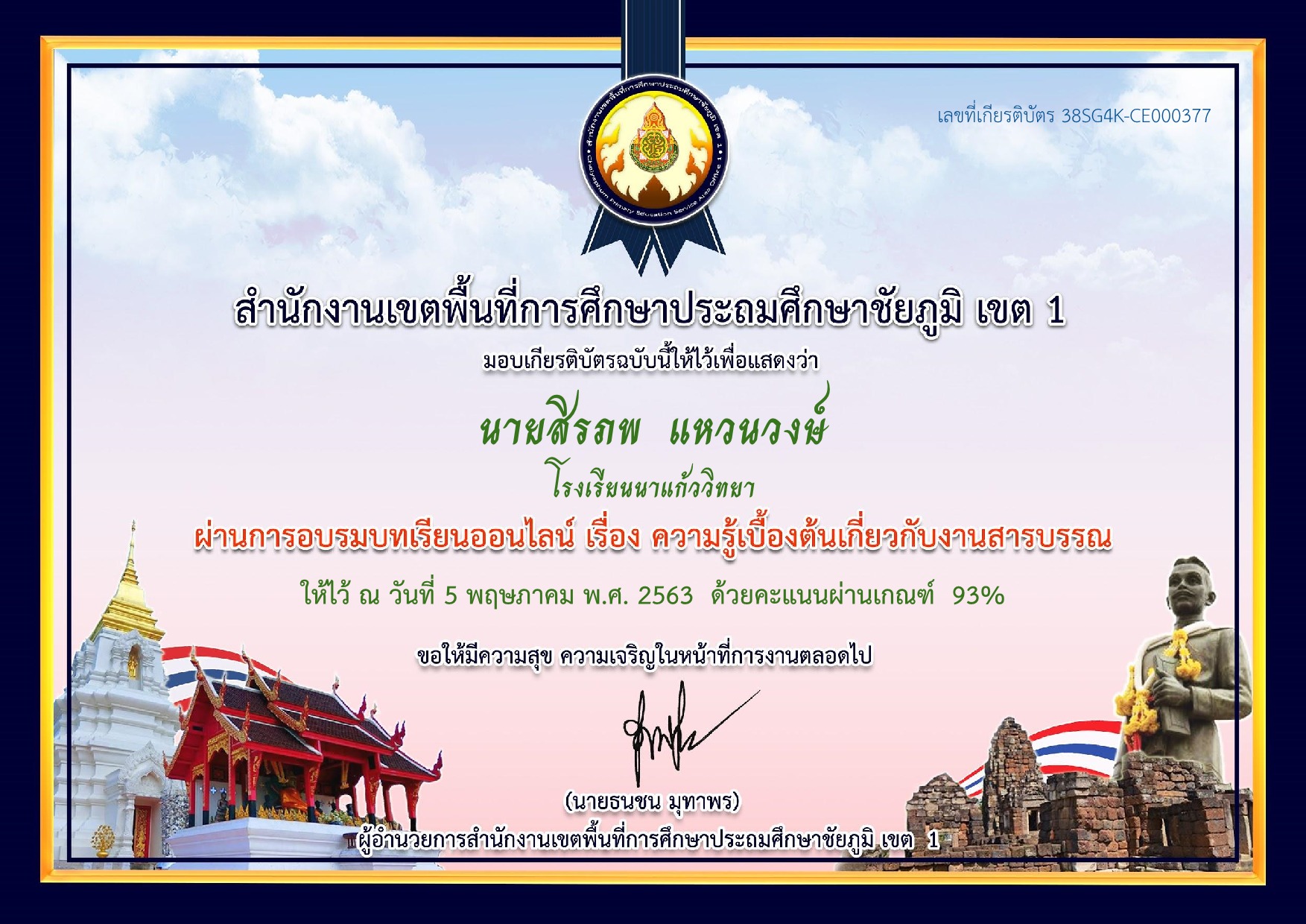 ชื่อผลงาน : เกียรติบัตรการอบรมเรียนออนไลน์ เรื่อง ความรู้เบื้องต้นเกี่ยวกับงานสารบรรณ