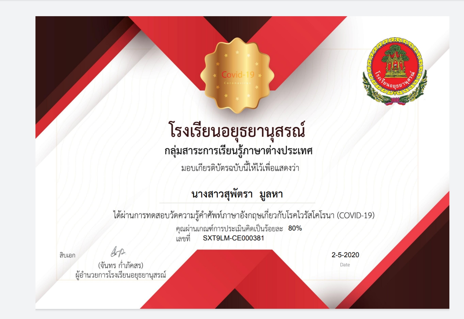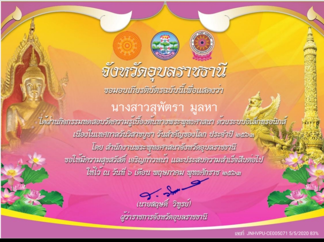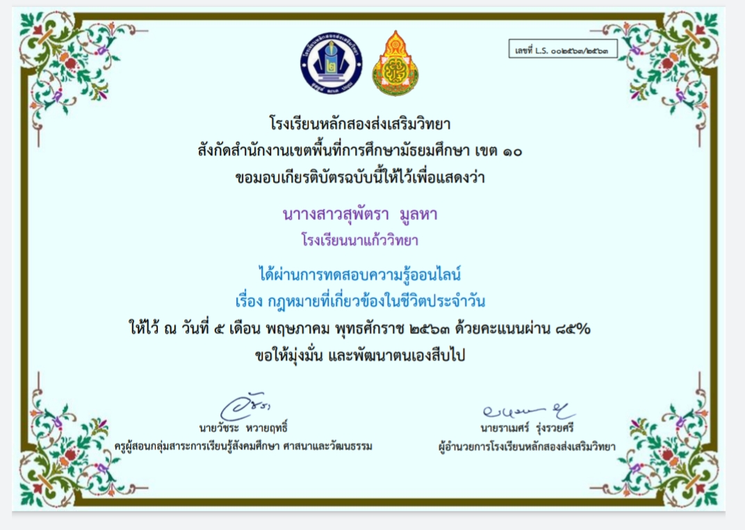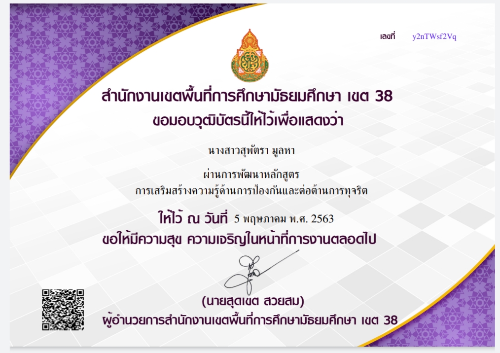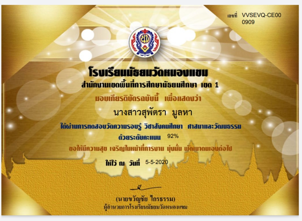 ผู้ฝึกสอนการแข่งขันประกวดโครงงานประวัติศาสตร์ กลุ่มสาระสังคมศึกษาศาสนาและวัฒนธรรมระดับชั้นมัธยมศึกษาปีที่ 4 - 5ได้รับรางวัลเหรียญทองการแข่งขันทักษะวิชาการนักเรียนองค์การบริหารส่วนจังหวัดศรีสะเกษครั้งที่ 13 ประจำปีงบประมาณ 2563 |